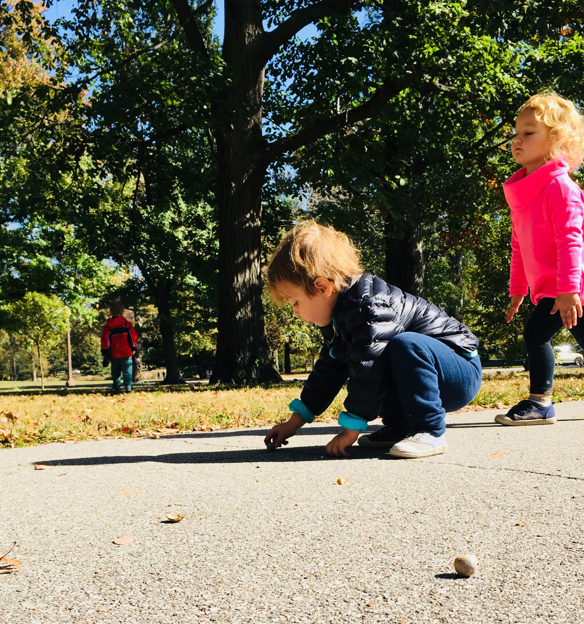 The acorns are dropping by the bushels around St Louis. We’ve had a lot of wind come through recently which I think accelerated the process. It also knocked down ripe persimmons, larger branches for fort building and a fresh blanket of orange pine needles under the pines that serve as homebase for Forest School. I guess wind blowing stuff around isn’t all bad? The colors warming in the landscape give a cozy new feel feel to time outside and new visual interest to take in wherever you look. The air is crisper, and the sunlight much softer. I come with anxiety out of the loud, busy, Covid- tainted metropolis on these Tuesday and Thursdays mornings but upon arrival at the park Pines, find a magical, natural wonderland with the children there and feel immediate restoration and peace.